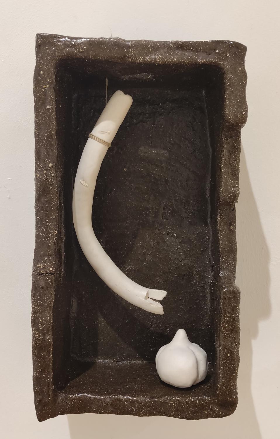 Naturaleza muerta con puerro y ajo. Cerámica esmaltada 30x17x12 cm 2025